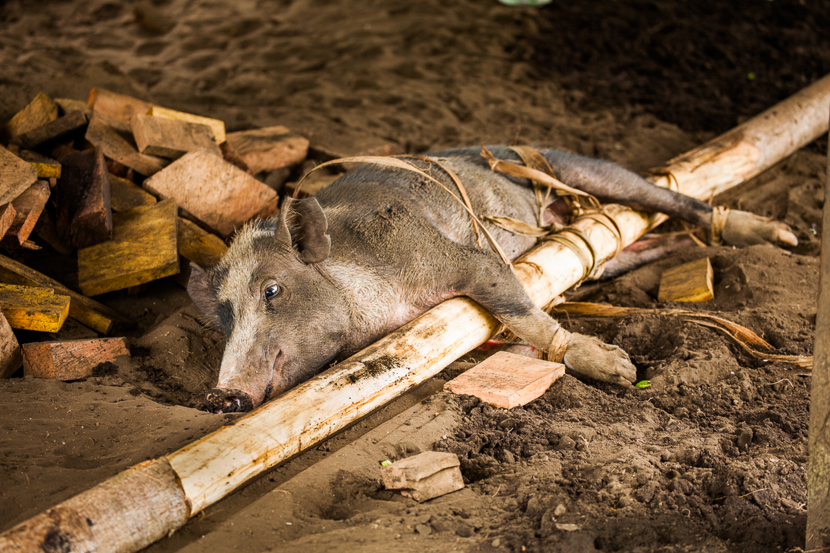Under the house in the middle of the village, where people congregated each day to talk, cook, chew betel nut and laugh, there was a pig tied up. It lay there in a still silence and I had a good idea of it’s fate. It would come to pass that two pigs were slaughtered in our honour – one in each of the villages we stayed. Both were grand feasts and I felt so privileged of the effort our village hosts went to.