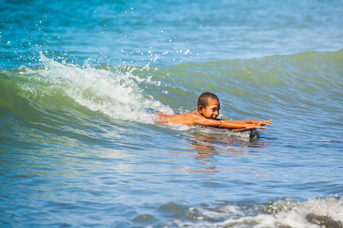 I was dripping with sweat and it looked like too much fun to miss out on. I took off my sarong and walked into the water. The boys were thrilled and one of them handed me his plank of wood to surf. I asked them to call me onto a good wave and they yelled with delight as I rode wave after tiny wave with them.